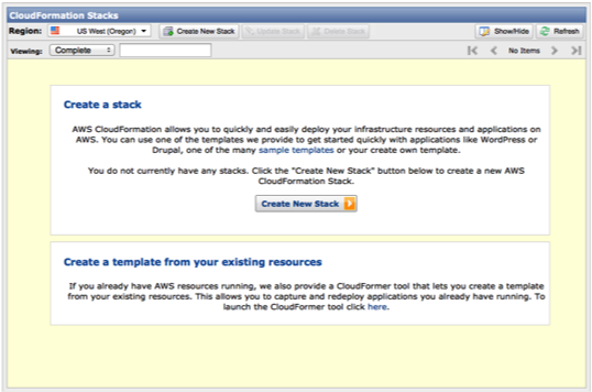 Select your region and push the create new stack button.